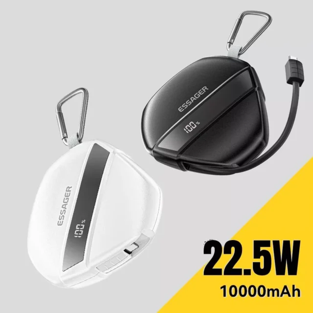 Equipped with a high-capacity 10000mAh Li-polymer battery, it supports ultra-fast 22.5W two-way quick charging — keeping your phone, tablet, or headphones juiced up in record time. Built-in retractable cables, including USB-Type C and Lightning, eliminate messy wires and make charging a breeze. The clear digital display keeps you informed of your remaining battery life, so you’re never caught off guard.