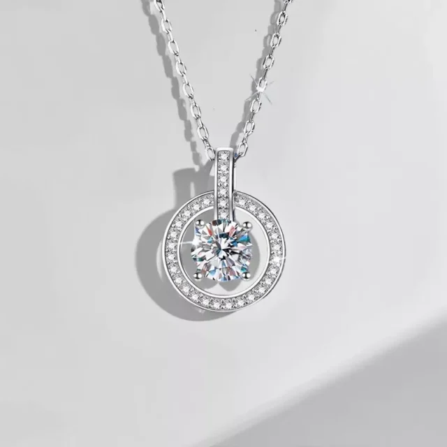 Grace meets geometry in this exquisite 1 carat moissanite pendant necklace, designed for the modern woman who appreciates timeless beauty with a touch of individuality. Set in genuine 925 sterling silver and featuring a round brilliant-cut D color moissanite, this necklace is your new favorite for adding understated luxury to any look. The unique lock clip design combined with a sleek collar chain brings contemporary charm to a classic pendant silhouette.