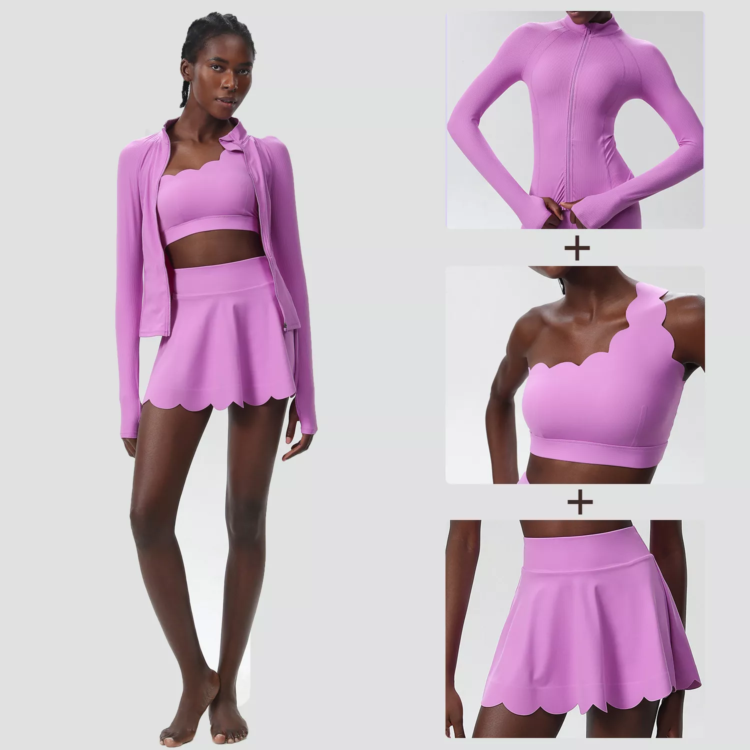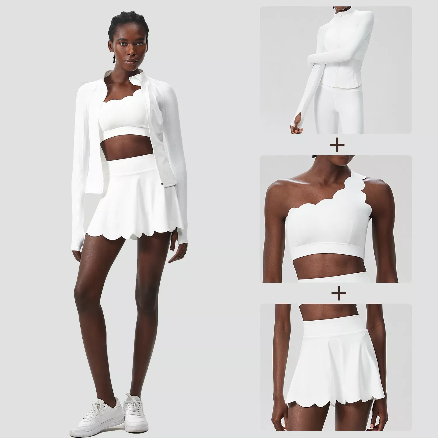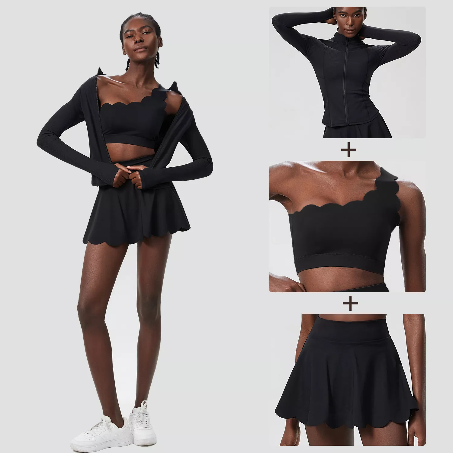 • 3-Piece Set: Includes a supportive top, a long-sleeve outer layer, and a skirt with built-in shorts.