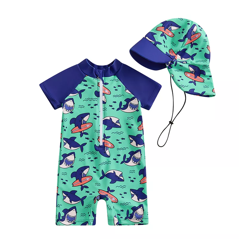 Make a splash this summer with our adorable Baby Boy Rash Guard Swimsuit, designed for maximum comfort and sun protection. Perfect for sunny beach days, pool parties, or just splashing in the backyard, this short sleeve bathing suit is as practical as it is cute. The easy zip-up design makes dressing a breeze, while the included matching sun hat keeps your little one shielded from harmful rays.