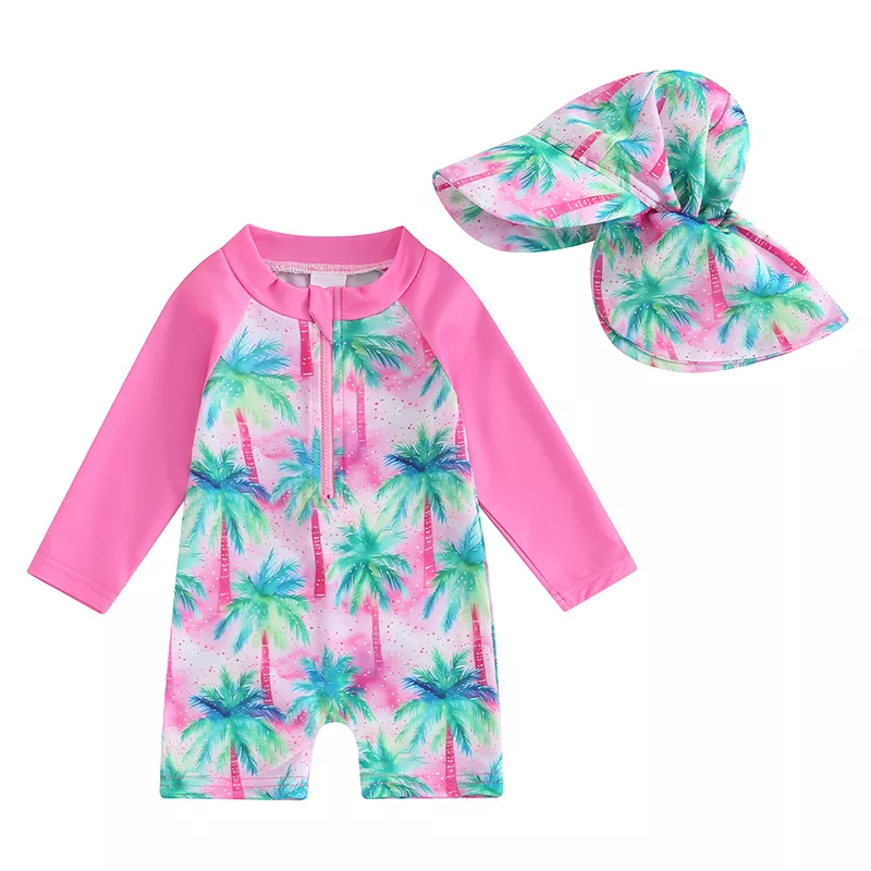 This swimsuit features a full-length zip-up front, making dressing and diaper changes fast and fuss-free. The vibrant floral and tropical tree prints bring a cheerful, summery vibe while the long sleeves provide extra coverage under the sun. Crafted from soft, breathable 100% polyester, it’s gentle on delicate skin and built to dry quickly. The included matching swim cap adds an extra layer of sun protection and completes the adorable look.