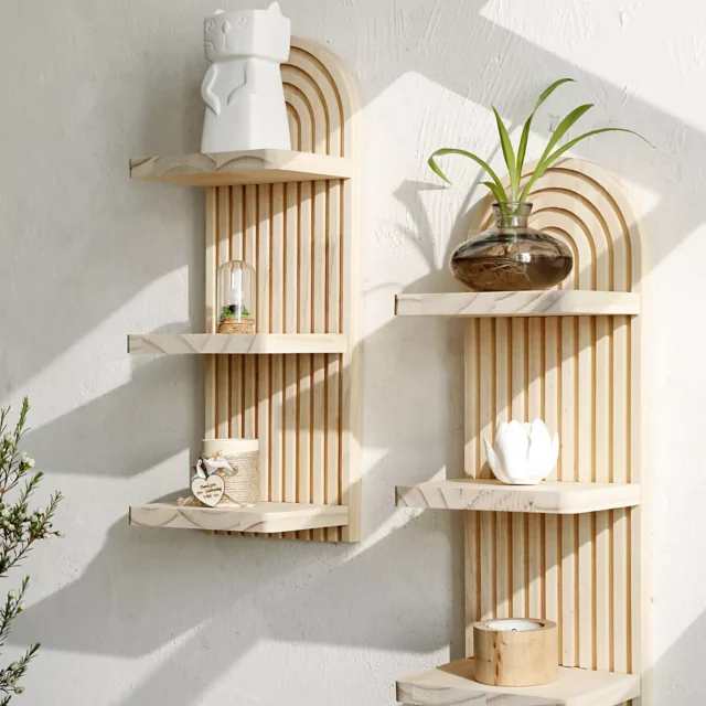 Unlike generic floating shelves, this 3-tier wooden shelf features a stunning arch silhouette and natural wood finish that stands out. Its clean lines and organic materials create a warm, earthy atmosphere, while the boho design adds a creative, relaxed feel to your home. It’s not just functional—it’s an artistic addition to any room.