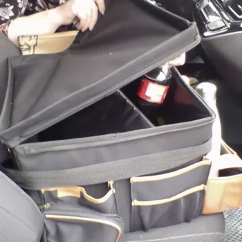 I've got this awesome thing on my passenger seat and I'm totally loving it! It makes it so simple to move all my stuff when I have passengers in the car. What's really cool is how easily the dividers adjust to fit larger things. I've got all sorts of useful items in there like a tire repair kit, wipes, paper towels, and a water bottle. And those little pockets are perfect for holding insurance cards, pens, and small notebooks. It's like a super convenient storage space right next to me!