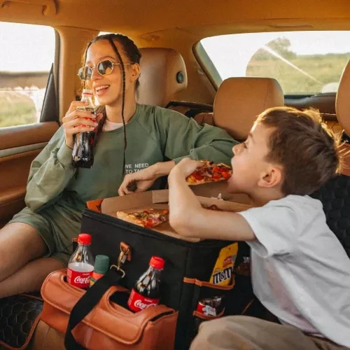 Great organizer for picnics and family road trips. Big and convenient. Fits well between two child seats.
