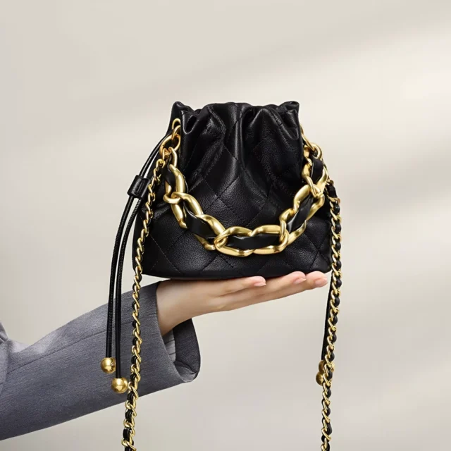 This isn’t just another accessory—it’s a fashion-forward essential for the modern woman. The quilted pattern and chain detail elevate it into the realm of luxury, while the practical bucket shape makes it ideal for everyday life. Its soft, supple texture offers comfort, and the versatile design makes it suitable for both casual and dressy occasions.