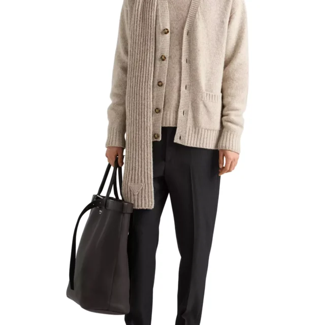 Prada is synonymous with luxury and impeccable style. This cardigan exemplifies the brand’s commitment to blending tradition with modernity. Its sumptuous cashmere fabric feels like a warm embrace, while its timeless design ensures it never goes out of fashion. The ribbed cuffs, hem, and V-neck elevate its structure, making it a statement piece that complements any outfit.