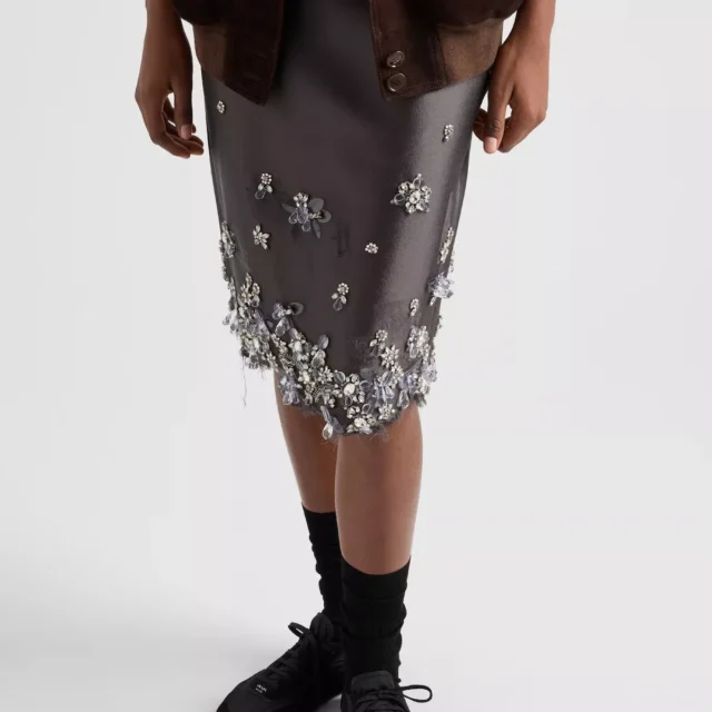 Prada’s Midi Skirt with Crystals is the ideal piece for those looking to make a bold statement without sacrificing elegance. It’s perfect for formal events, evening outings, or a chic daytime look when you want to add an extra touch of glamour. Whether paired with a simple blouse for a polished daytime appearance or dressed up with a luxurious top for an evening out, this skirt will ensure you’re the center of attention. Its versatility allows you to effortlessly transition from day to night while maintaining a sophisticated look.
