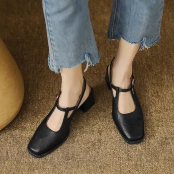 2025 Vintage T-Strap Leather Sandals for Women – Square Heel Summer Pumps