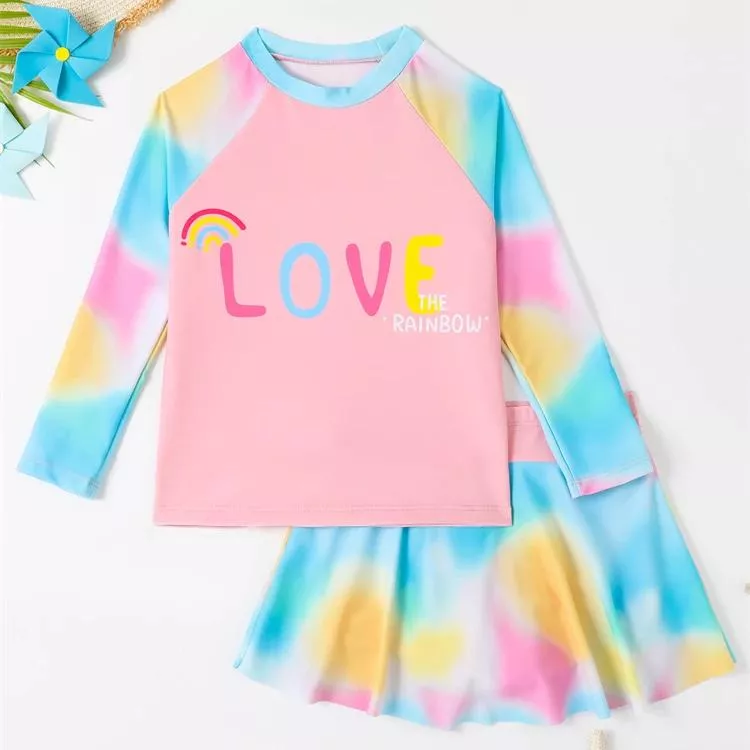 Girls Tie-Dye Long Sleeve Two-Piece Swimsuit with Skirt – Summer Beachwear