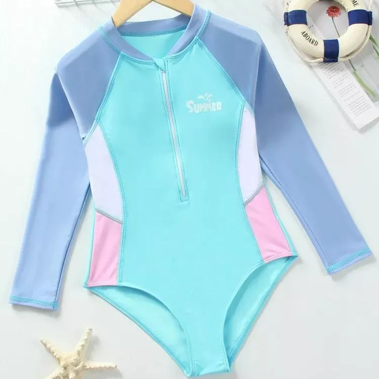 Girls Long Sleeve One Piece Swimsuit – Solid Color Summer Swimwear
