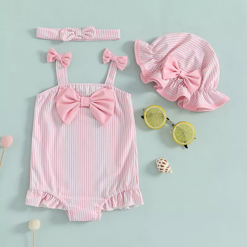 Toddler Girl 3-Piece Striped Swimsuit Set with Sun Hat & Bow Headband