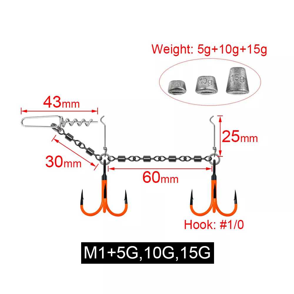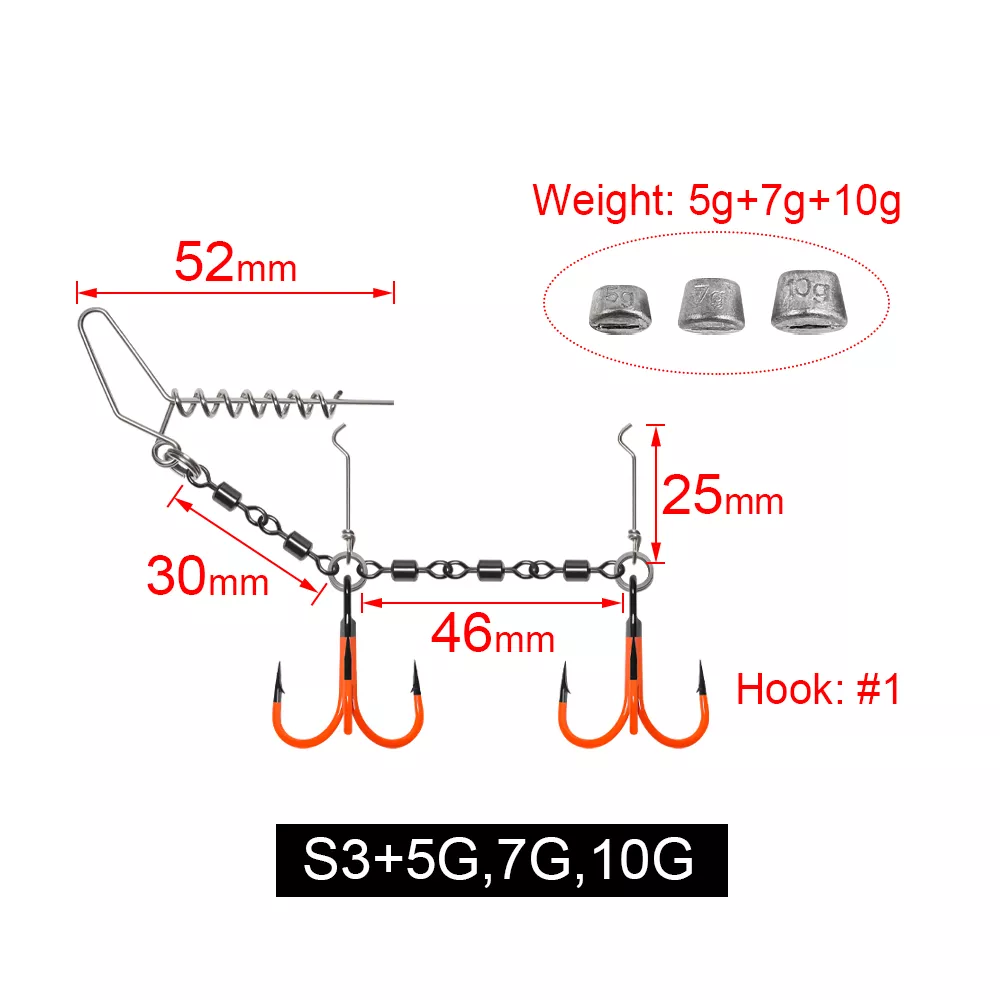 The rig features two razor-sharp treble hooks connected with different lengths of lead, allowing you to strategically position each hook for maximum coverage without affecting the bait’s natural action. The integrated coil spring corkscrew locks into soft baits effortlessly, giving you a rock-solid, secure mount in seconds. It’s the ideal setup when chasing hard-hitting species like pike, bass, trout, carp, and even ocean dwellers like tuna and halibut.
