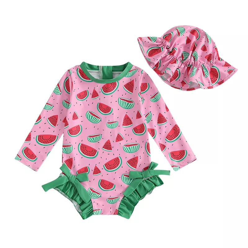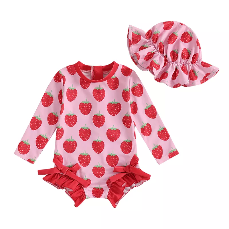 Make a splash this summer with the cutest toddler swimwear around! This long sleeve rash guard swimsuit set is perfect for your little girl’s beach days, pool parties, or sunny vacations. Designed with a sweet strawberry or watermelon print, adorable bows, and ruffle detailing, your child will stand out in style while staying protected under the sun. The included matching cap completes the look while offering extra coverage for delicate skin. Whether it’s for swimming lessons or a family getaway, this swim set combines fashion with function in the most delightful way.