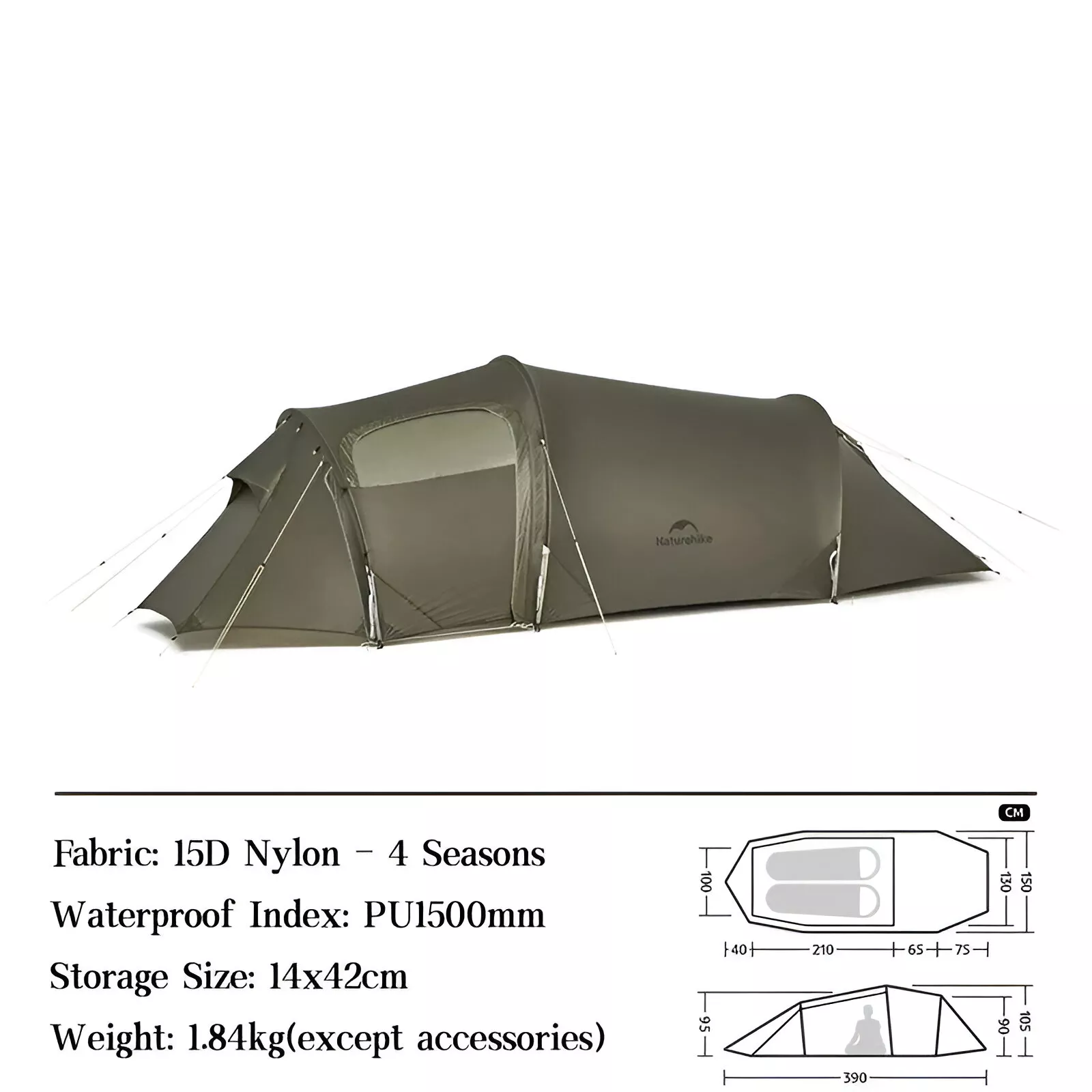 Unlike ordinary tents, this one is built for serious adventurers. Its tunnel structure offers greater interior space while keeping the weight low. The living room area lets you store gear or cook safely in bad weather. The double-layer design not only provides excellent thermal insulation but also increases durability and water resistance. Easy to pitch and even easier to pack down, this tent is ready to move when you are.