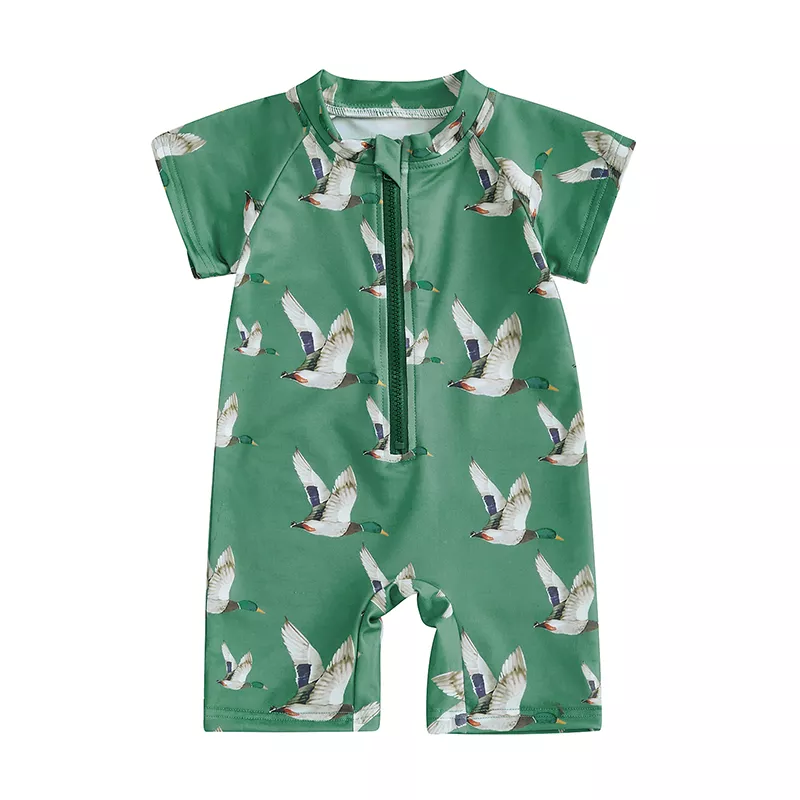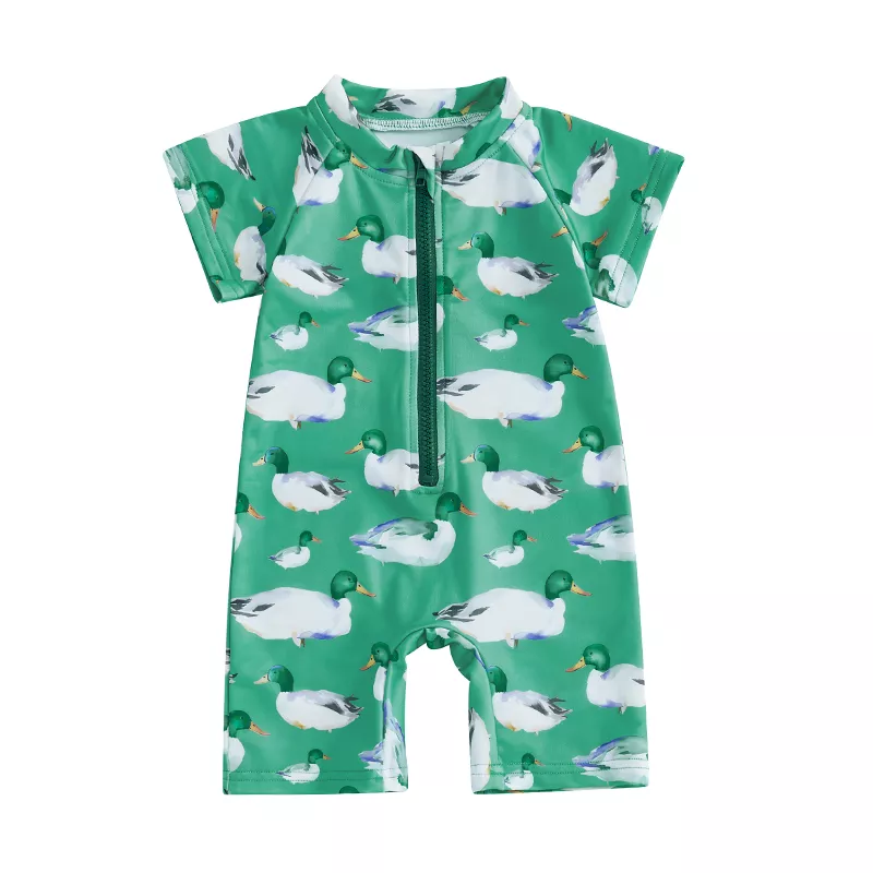 Make a splash this summer with our Wild Duck Print Toddler Rash Guard Swimsuit — the perfect blend of playful design and all-day comfort. Designed for active little ones, this zip-up short sleeve swimsuit is a must-have for beach days, pool parties, or backyard water play. Featuring a charming green base and cheerful duck print, it adds fun to every swim while keeping your baby comfortable and cute.