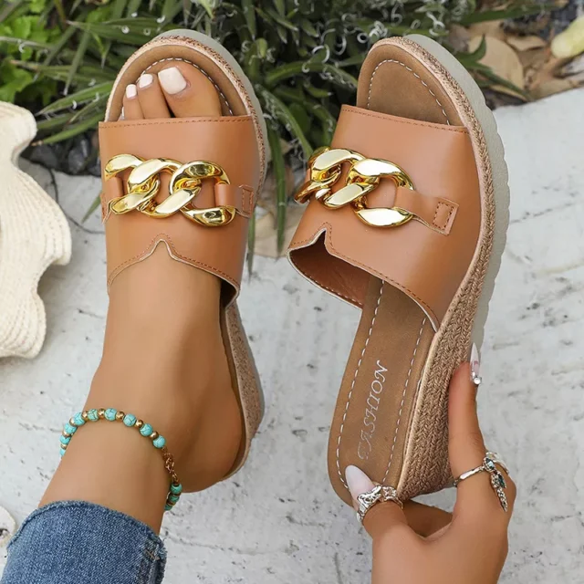 Step into bold, easy-going fashion with these stunning chain decor wedge sandals, the ultimate summer companion for women who love style and comfort in equal measure. With a sleek design, elevated platform, and chic metallic chain detailing, these slip-on sandals are perfect for beach getaways, shopping days, or just relaxing outdoors. Designed to complement a wide range of summer looks, they add height, glam, and comfort without compromise.