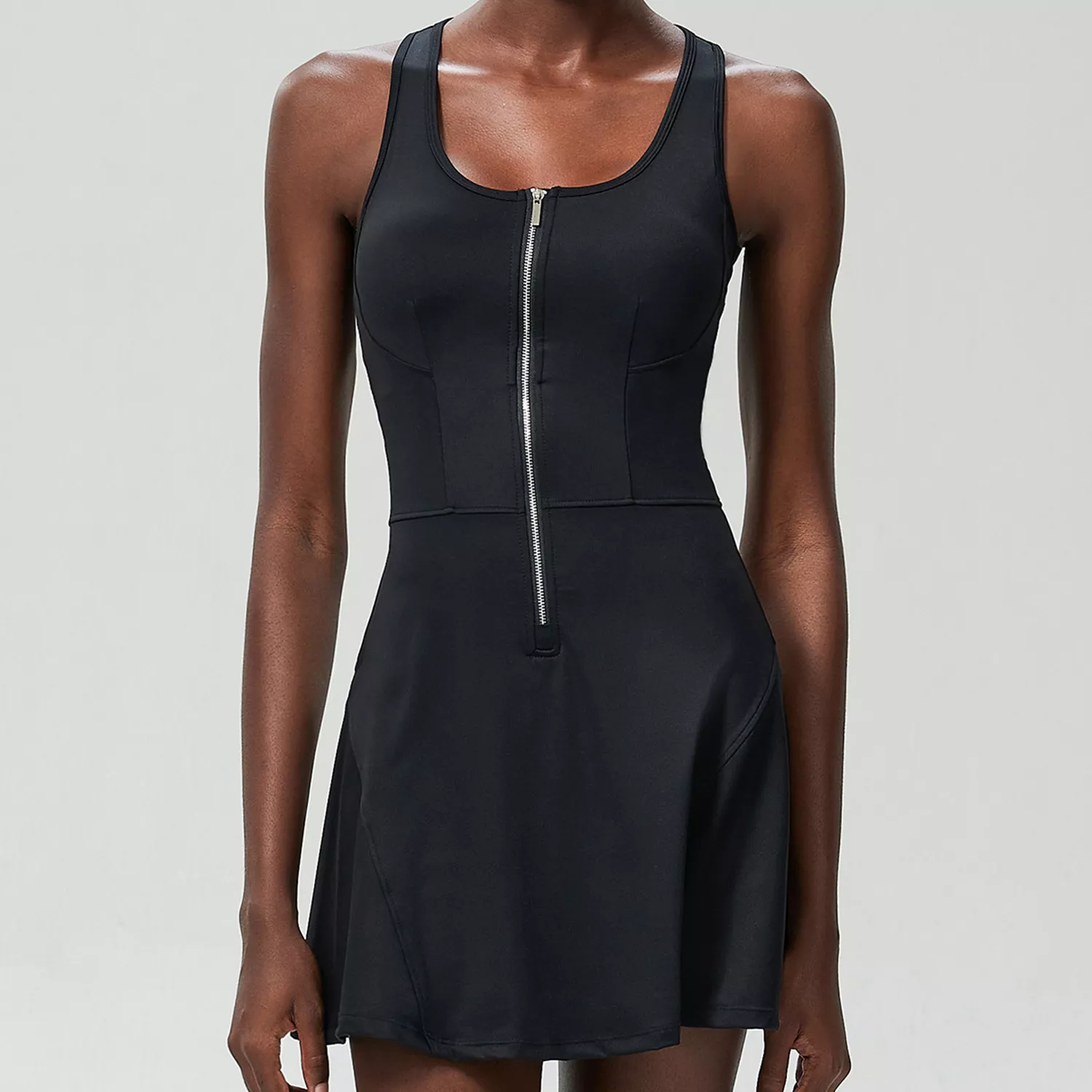 Crafted with a breathable blend of nylon and spandex, the fabric is soft, stretchy, and quick-drying — perfect for high-energy workouts or all-day wear. Its sleeveless design and above-knee mini skirt length offer maximum freedom of movement and an effortlessly chic silhouette. Ideal for tennis, running, yoga, gym sessions, or even casual outings, this all-in-one piece is a staple for every active woman’s wardrobe.