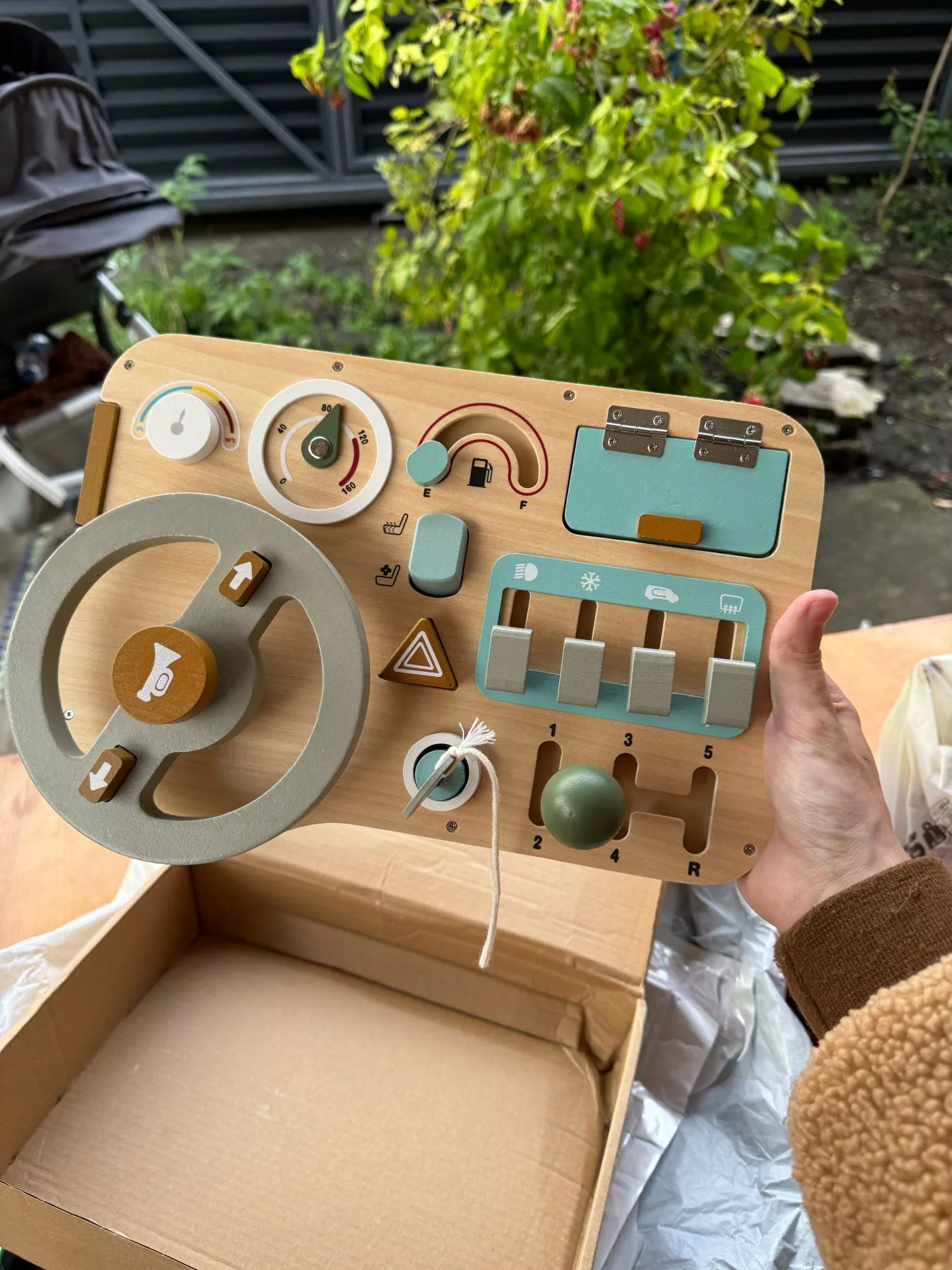 Watch your little one’s creativity soar with our Wooden Montessori Busy Board Steering Wheel Toy! Designed to mimic a real car dashboard, this multifunctional sensory toy offers endless possibilities for imaginative play. Perfect for toddlers and preschoolers, this educational toy encourages hands-on learning, fine motor skill development, and logical thinking. Whether your child is pretending to drive a car, truck, or bus, this busy board will keep them entertained and engaged for hours.
